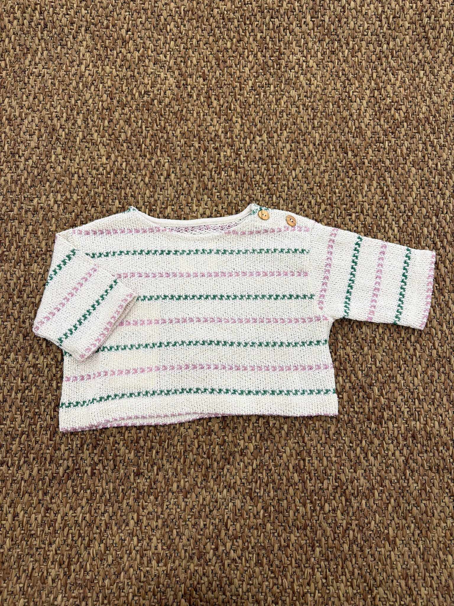 Questa maglia bambina ha scollo rotondo, maniche lunghe, spalle scese, apertura sulla spalla con bottoni in cocco e il nostro motivo a righe.