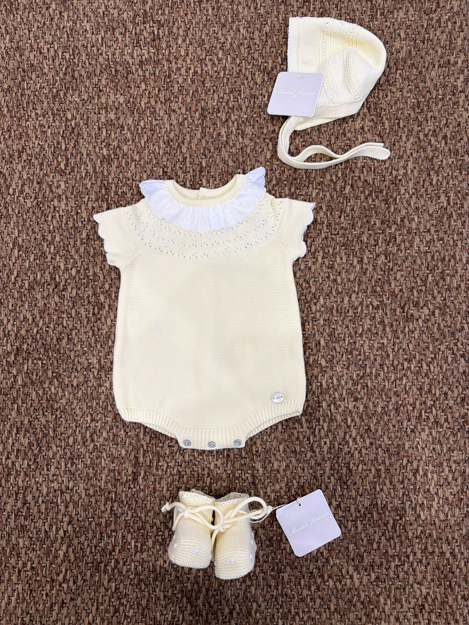 Pagliaccetto neonata collo volant con scarpine e cuffia Martin Aranda